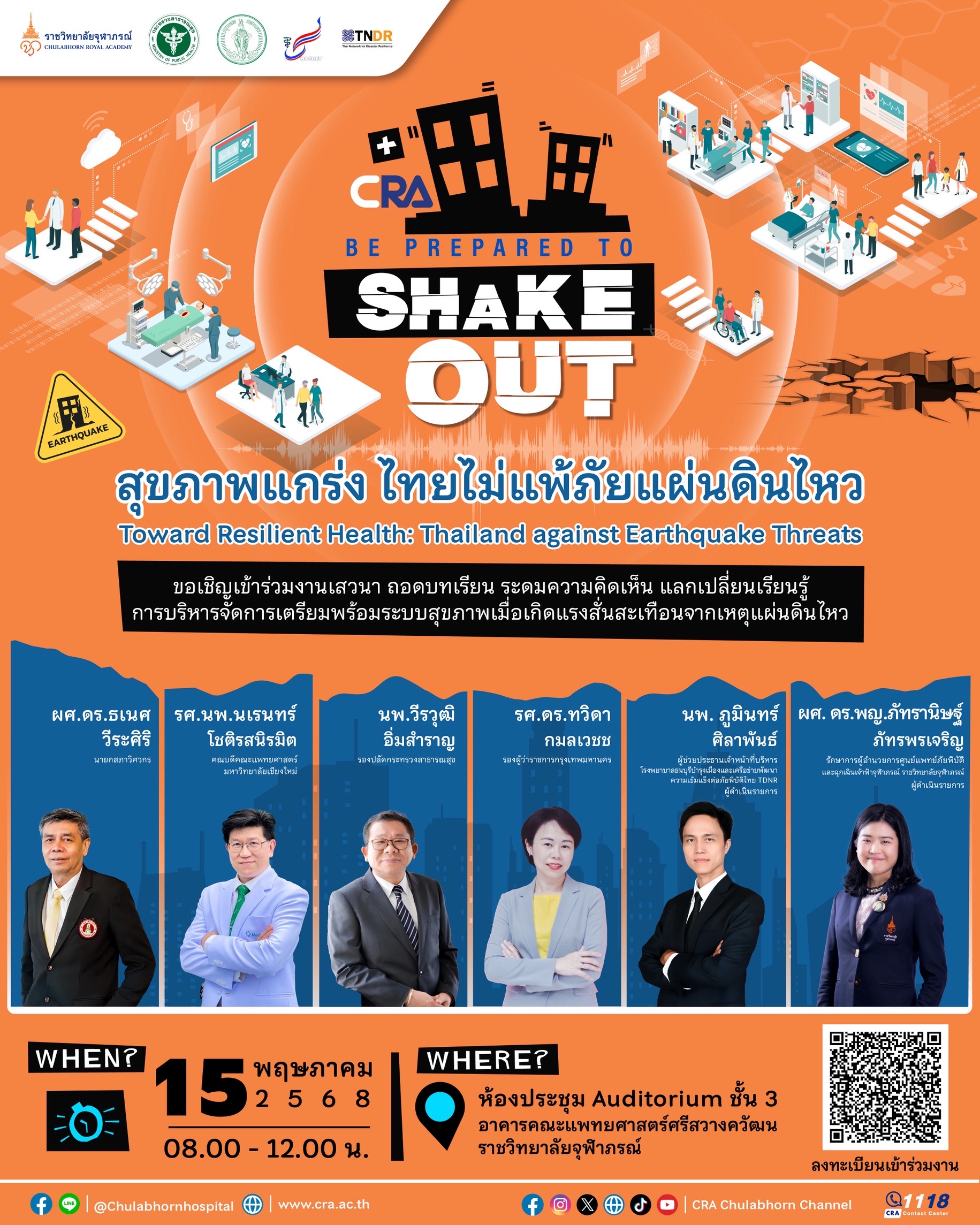 ราชวิทยาลัยจุฬาภรณ์ โรงพยาบาลจุฬาภรณ์ ร่วมกับ กระทรวงสาธารณสุข กรุงเทพมหานคร เครือข่ายโรงพยาบาลกลุ่มสถาบันแพทยศาสตร์แห่งประเทศไทย (UHosNet) และ เครือข่ายพัฒนาความเข้มแข็งต่อภัยพิบัติไทย (TNDR) บูรณาการความร่วมมือจัดงาน “สุขภาพแกร่ง ไทยไม่แพ้ภัยแผ่นดินไหว” Toward Resilient Health: Thailand against Earthquake Threats